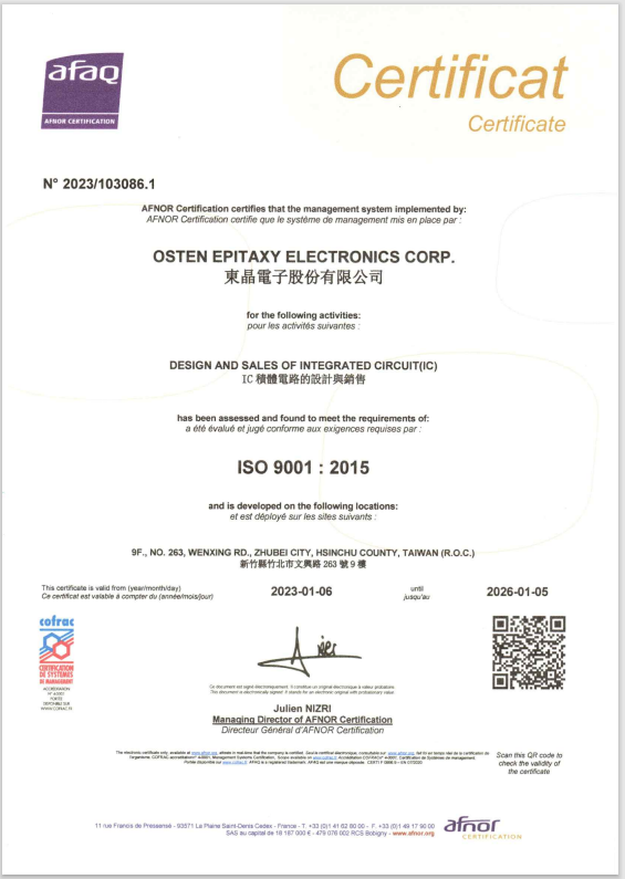 東晶電子取得ISO 9001:2015 證書,讓客戶滿意是我們最高目標,我們堅持一次就把工作做對。
